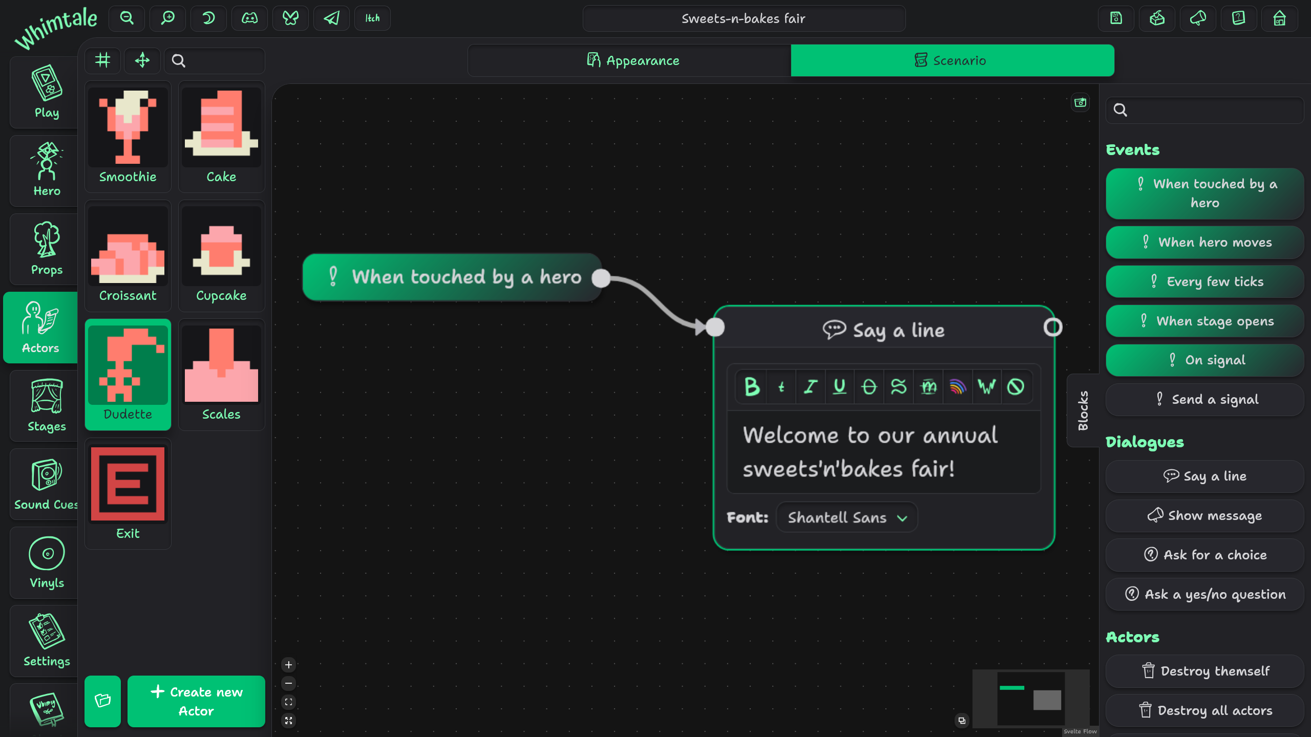Нарисуй Актёров и Реквизит во встроенном пиксельарт-редакторе, построй уровни и переходы между ними в редакторе Сцен, и создавай звуковые эффекты прямо в Whimtale.