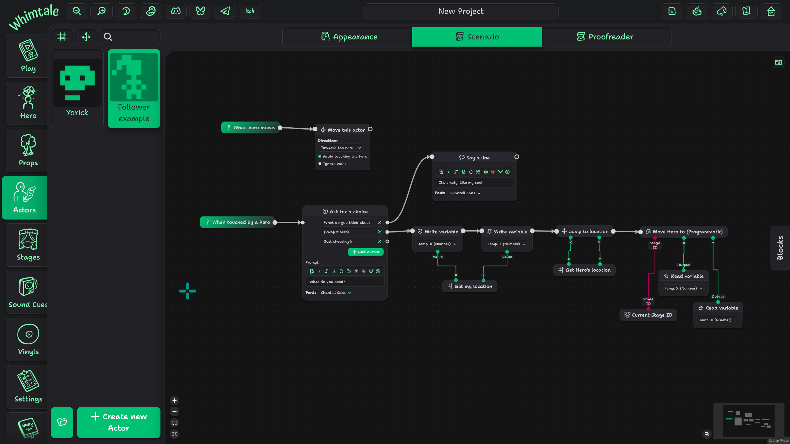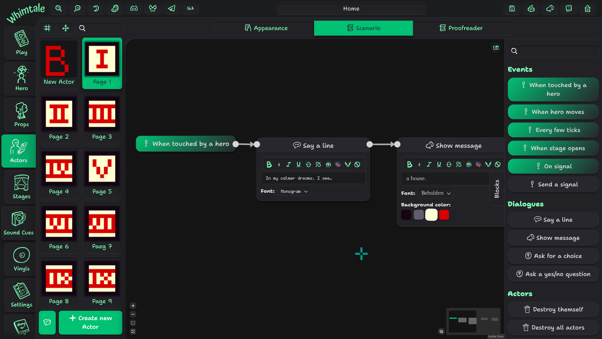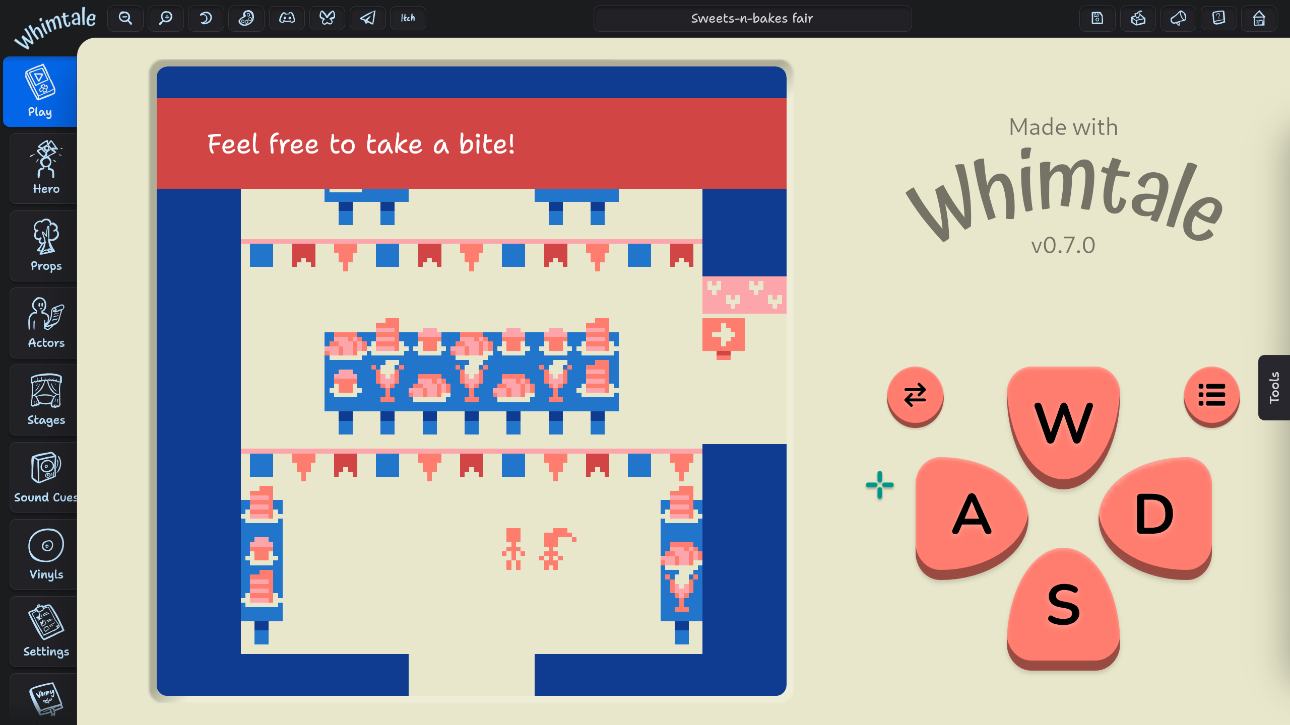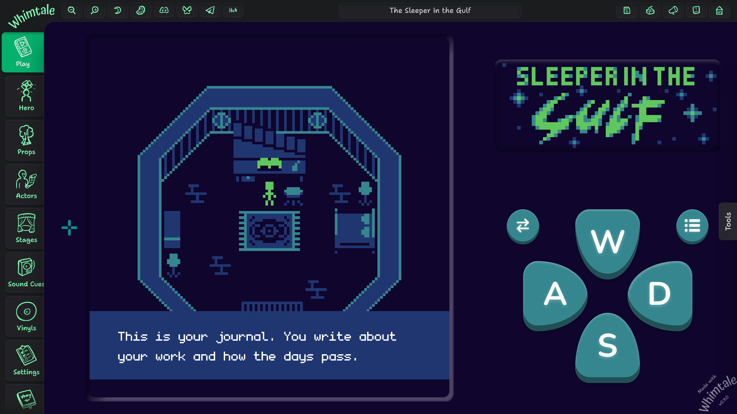 Whimtale — это небольшой, простой в использовании игровой движок для создания маленьких историй, где вы создаёте миры и персонажей, чтобы взаимодействовать с ними своим героем! Движок работает непосредственно в браузере — даже работает в автономном режиме! — и экспортирует игры как портативные HTML-файлы, которые вы можете отправить своим друзьям. Во Whimtale уже запрограммированы все механики, он не требует навыков программирования и содержит все необходимые инструменты для создания игр!
