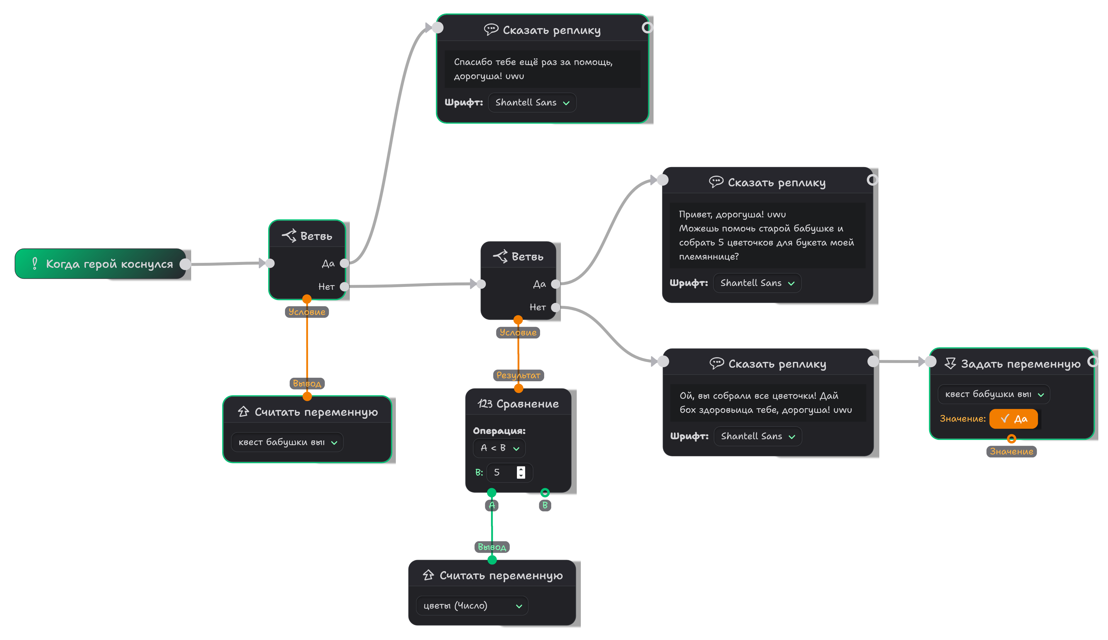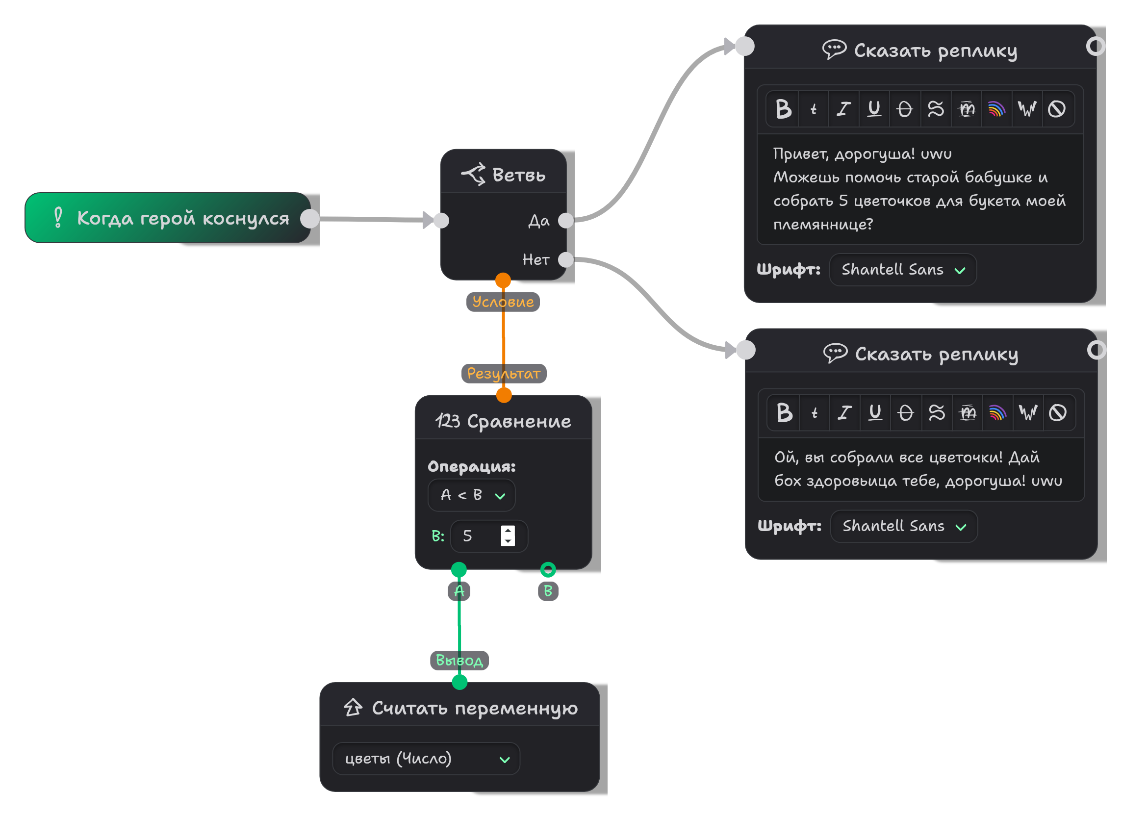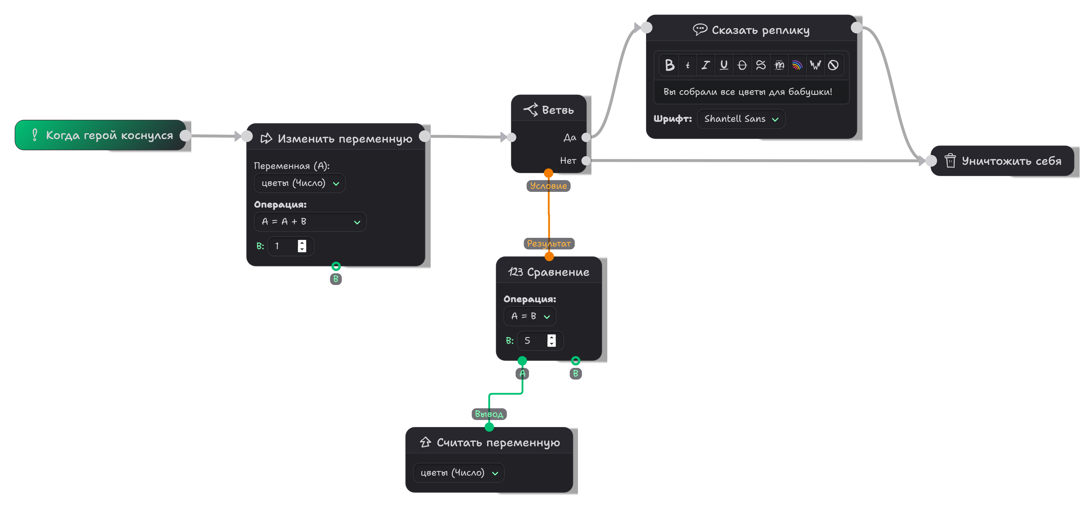 цветыв блоке "Читать переменную". Затем соедините его вывод со входом A блока Сравнения. В самом блоке Сравнения установите B как 5. Наконец, соедините Результат сравнения с Ветвлением. - Добавьте новый блок "Сказать реплику" (или "Показать сообщение") — он будет отображаться, когда герой соберёт пятый цветок. Соедините его с выхода "Да" у Ветви, и также с блоком "Уничтожить себя".