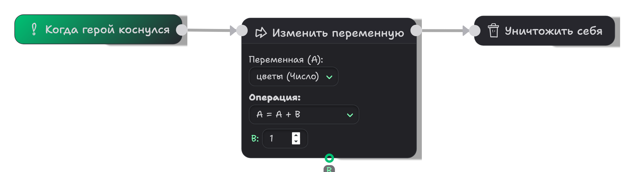 Блок "Изменить переменную", в настройках которого будет увеличивать переменную цветы на 1 каждый раз, когда герой касается цветка. После этого цветок уничтожит себя с помощью блока "Уничтожить себя".