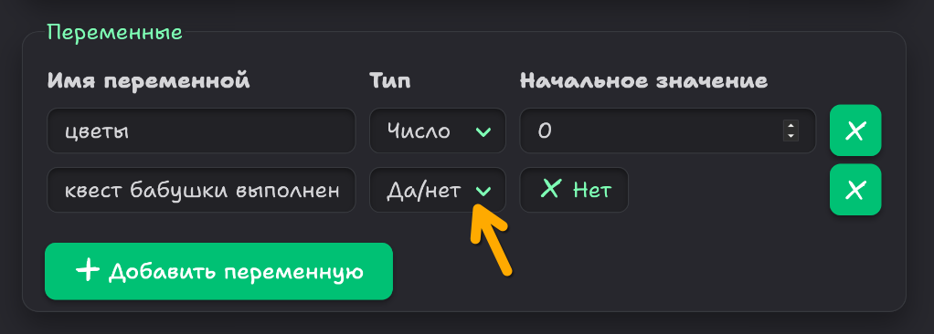 Чтобы решить эту проблему, мы добавим ещё одну переменную, которая сообщит нам, передали ли мы цветы бабушке. Перейдите на вкладку "Настройки" или нажмите кнопку "Управление переменными" в разделе "Данные" библиотеки сценариев и создайте новую переменную "квест бабушки выполнен". Установите её тип как "Да/Нет" и убедитесь, что её начальное состояние — "Нет".